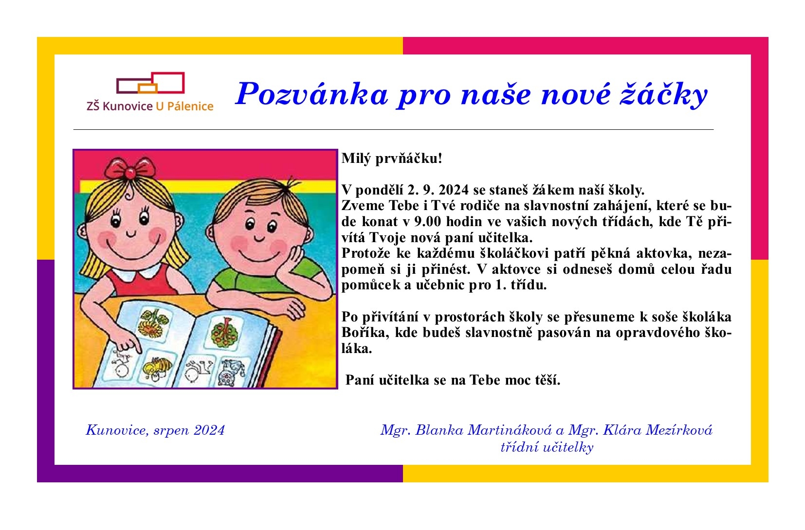 Vážení rodiče, zahájení školního roku 2024/2025 se pro naše nové prváčky uskuteční v pondělí 2. září 2024 od 9 hodin. Nové žáčky přivítají nejen jejich třídní učitelky, Mgr. Blanka Martináková a Mgr. Klára Mezírková, ale také ostatní žáci školy a všichni vyučující. Poté se společně přesuneme na Panský dvůr k soše školáka Boříka, kde se od 10 hodin uskuteční slavnostní pasování na opravdové školáky. V přílohách najdete jak pozvánku na slavnostní zahájení školního roku, tak rozdělení žáků prvního ročníku do tříd.