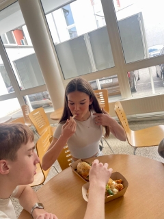 Součástí návštěvy byl také nevšední gastronomický zážitek. Ve škole totiž probíhal školní food festival America Day, který připravili studenti 2. ročníku oboru Hotelnictví a cestovní ruch. Naši žáci tak měli možnost ochutnat pravé americké hotdogy a osvěžující nápoje.