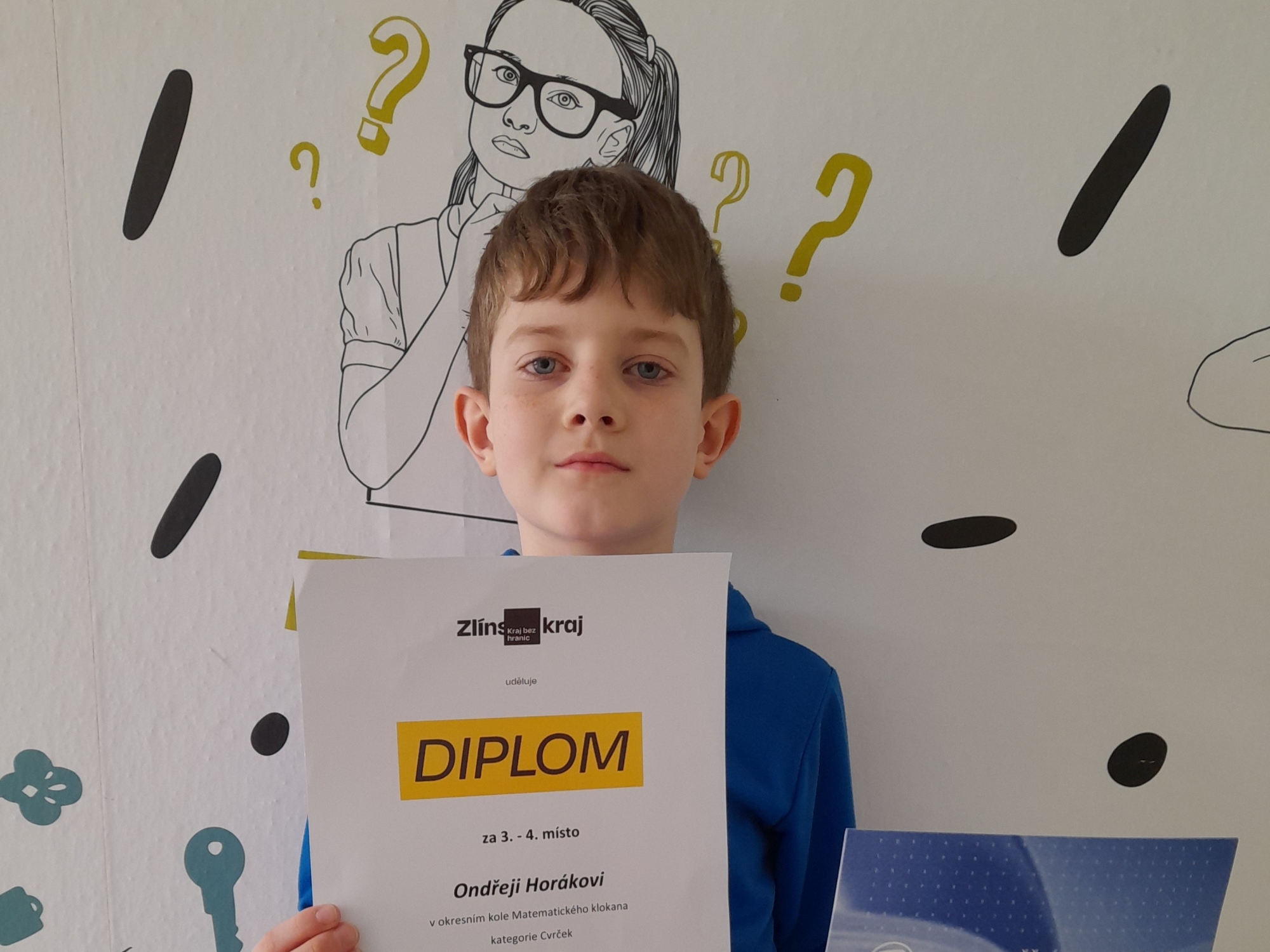 Zapojili jsme se do mezinárodní soutěže Matematický klokan a to hned v několika kategoriích: Cvrčkovi (2. - 3. třída), Klokánkovi (4. - 5. třída), Benjamínovi (6. - 7. třída) a Kadetovi (8. - 9. třída). Naši žáci řešili logické a matematické úlohy. Snažili se všichni, v nejmladší kategorii jeden z Cvrčků zazářil. Skvělý úspěch se podařil Ondrovi Horákovi z 3.A, který se umístil na výborném 3. místě v okrese. Ondra z možných 90 bodů získal 85, což znamená, že měl všechno správně a jen na jedinou otázku neodpověděl. Ondro, gratulujeme!