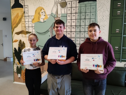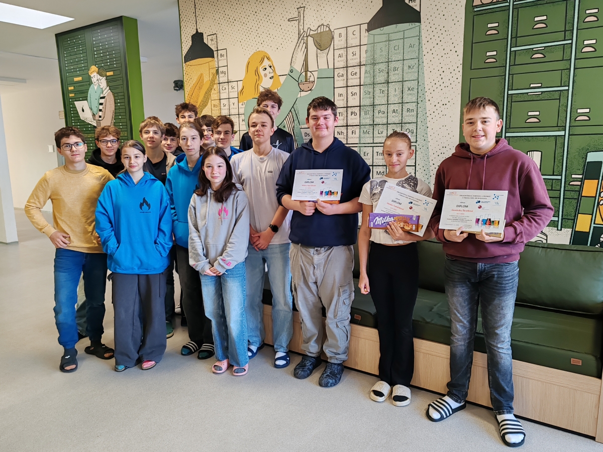 A jak soutěž v naší škole letos dopadla? Nejlépe se dařilo Jiřímu Horáčkovi z 9.A, který zaslouženě obsadil 1. místo. Na stříbrný stupínek vystoupala Denisa Tománková z 9.B a třetí příčku obsadil Dominik Škrášek z 9.B. Děkujeme všem soutěžícím a postupujícím budeme držet palce v krajském kole.
