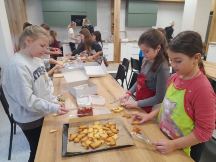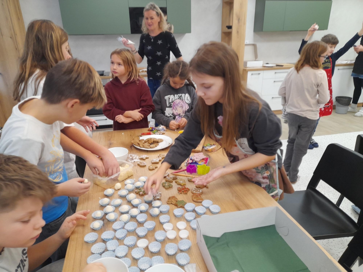 Adventní čas jsme letos přivítali tím nejlepším způsobem — pečením vánočního cukroví. Celá škola voněla po perníčcích a rohlíčcích, až se kolemjdoucím sbíhaly sliny. Na pomoc nám dorazily čtyři maminky a jedna babička, které se vrhly do práce s námi.