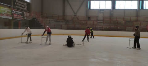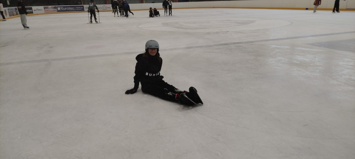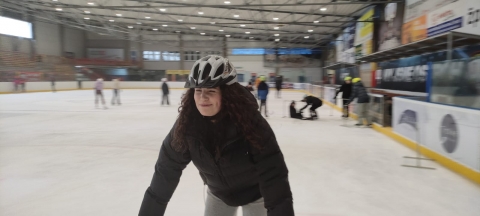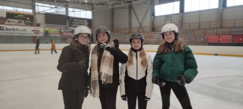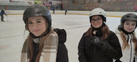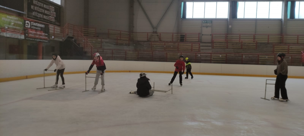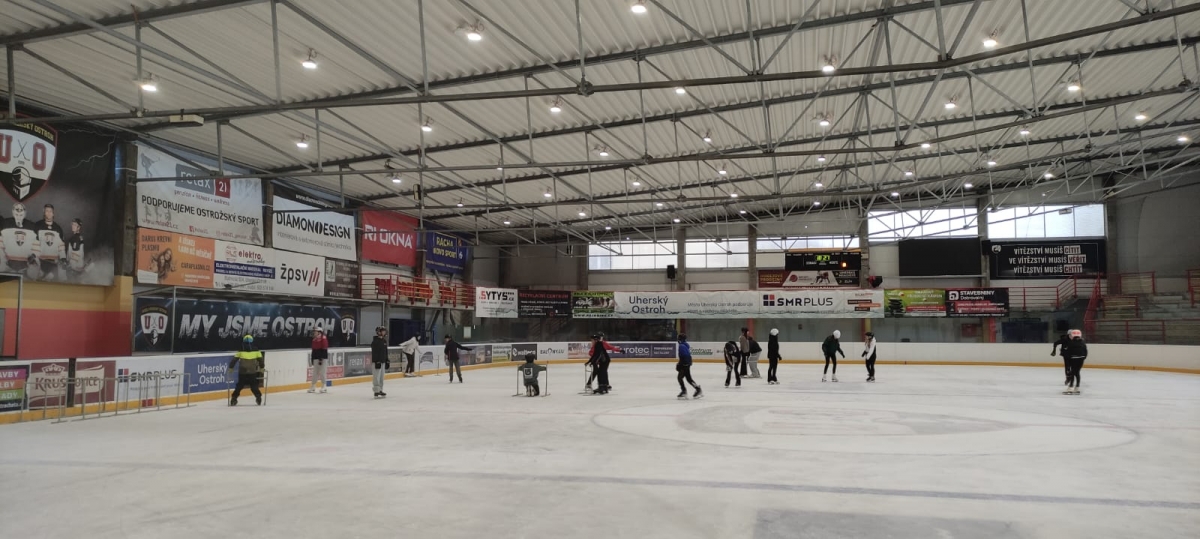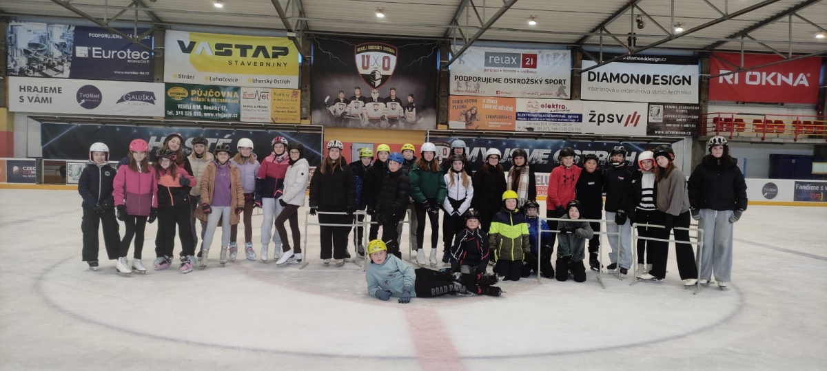 Na zimní stadion do Uherského Ostrohu se v pátek 12. prosince vydali naši sedmáci. Pro žáky byla připrvena krásně upravená  ledová plocha, která patřila celé dopoledne pouze jim. Společný čas jsme si užili v pohybu a moc nás to bavilo. Někteří bruslili ladně a s jistotou, jiní zkoušeli první krůčky, ale každý si našel to své. Méně zkušení bruslaři využili pomůcky, které jim pomohly udržet rovnováhu. Brzy šlo vidět, že si všichni bruslení naplno užívají. Hokejisti nám předvedli jízdu pozadu i rychlé otočky.
