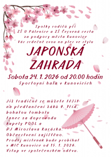 Přijměte naše srdečné pozvání a pojďte s námi vstoupit do japonské zahrady plné tančících deváťáků. Tradiční ples Spolků rodičů se koná již tuto sobotu 24. 1. 2026 od 20:00 ve sportovní hale v Kunovicích.