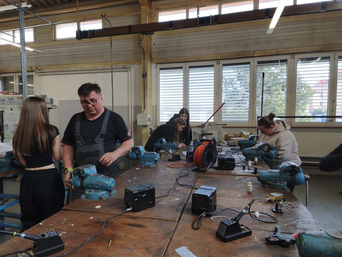 Naši žáci si vyzkoušeli například pájení drátů, ovládání robotické ruky, se kterou obtahovali předtištěný tvar dvojité šipky, nebo programování CNC frézky pomocí počítače. Velký zájem vzbudila také práce se dřevem, kdy žáci opracovávali připravené kousky dřeva, ze kterých si vyrobili praktický stojánek na mobilní telefon. Zájemci si na něj navíc mohli nechat vygravírovat své jméno nebo vlastní logo.