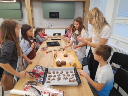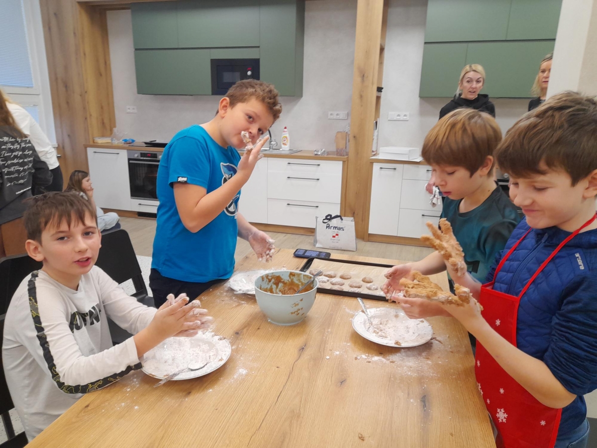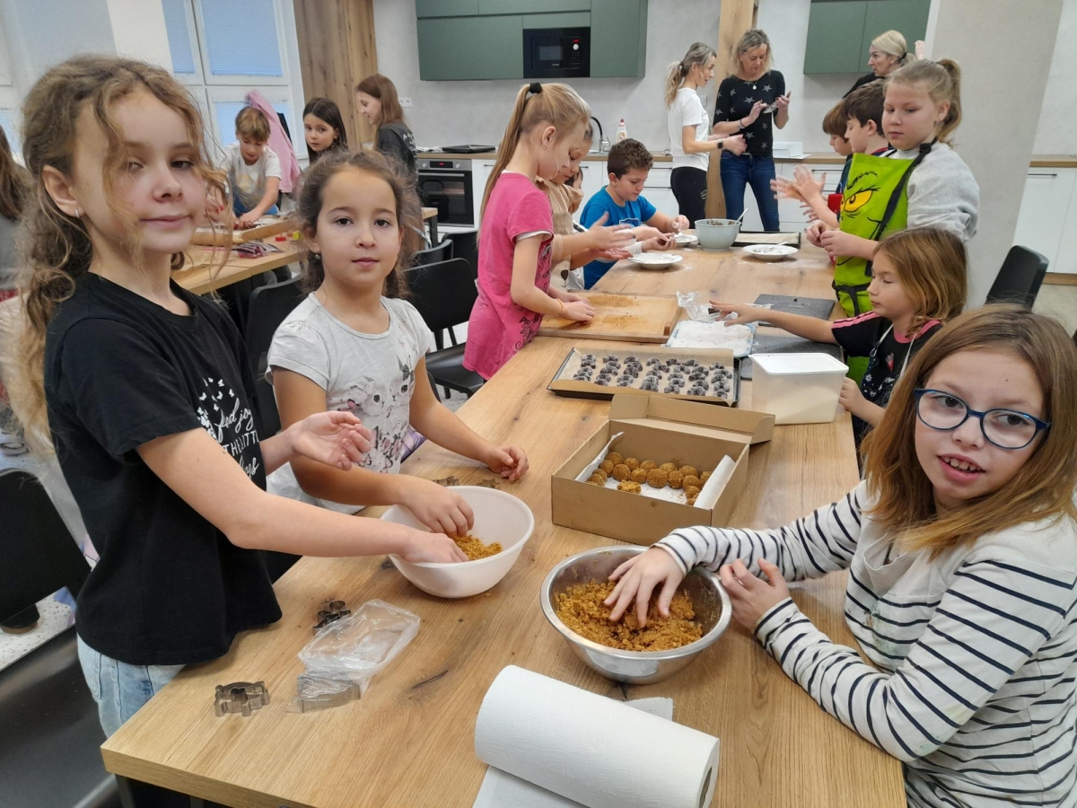 Adventní čas jsme letos přivítali tím nejlepším způsobem — pečením vánočního cukroví. Celá škola voněla po perníčcích a rohlíčcích, až se kolemjdoucím sbíhaly sliny. Na pomoc nám dorazily čtyři maminky a jedna babička, které se vrhly do práce s námi.
