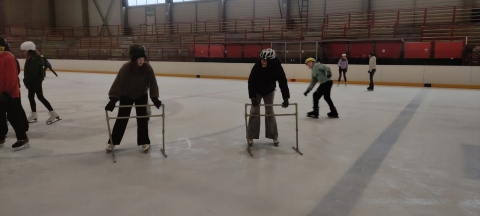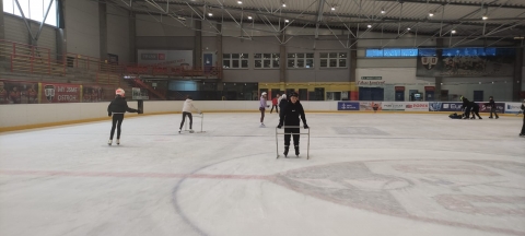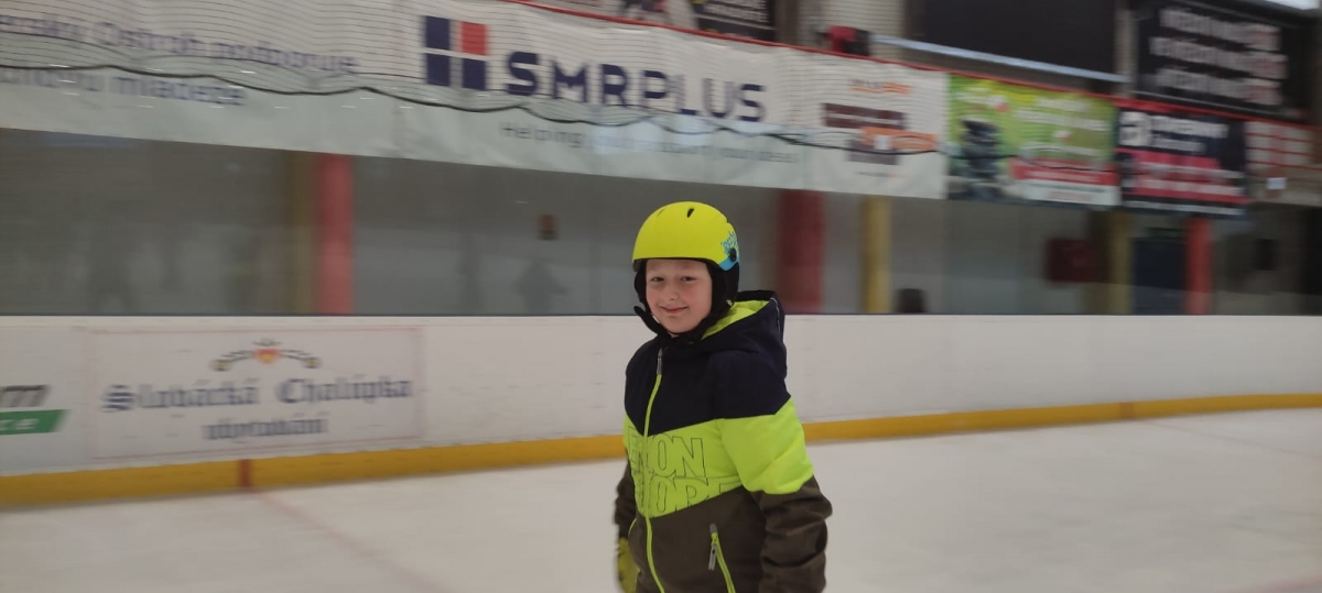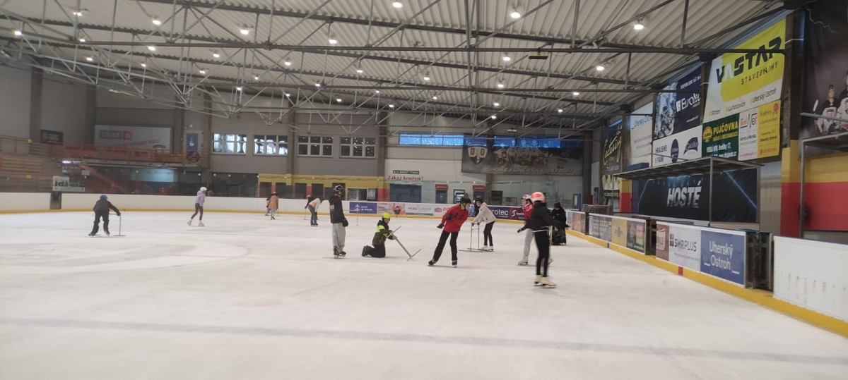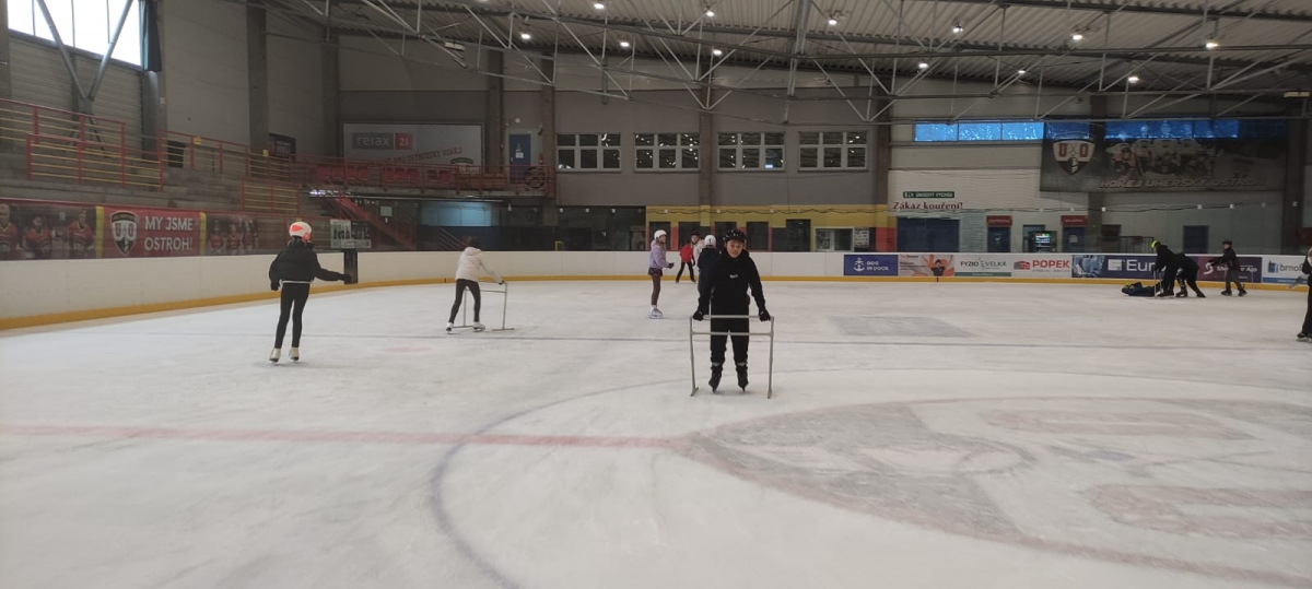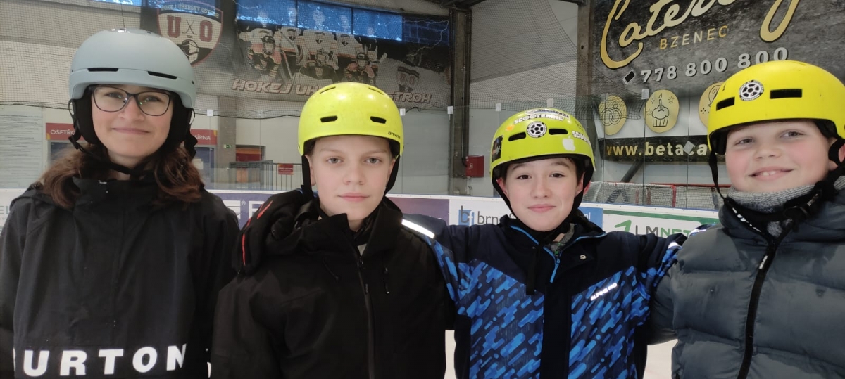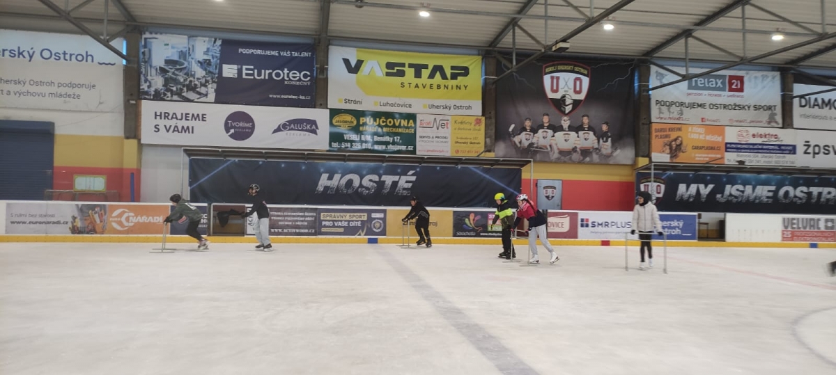 Na zimní stadion do Uherského Ostrohu se v pátek 12. prosince vydali naši sedmáci. Pro žáky byla připrvena krásně upravená  ledová plocha, která patřila celé dopoledne pouze jim. Společný čas jsme si užili v pohybu a moc nás to bavilo. Někteří bruslili ladně a s jistotou, jiní zkoušeli první krůčky, ale každý si našel to své. Méně zkušení bruslaři využili pomůcky, které jim pomohly udržet rovnováhu. Brzy šlo vidět, že si všichni bruslení naplno užívají. Hokejisti nám předvedli jízdu pozadu i rychlé otočky.