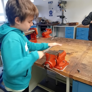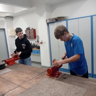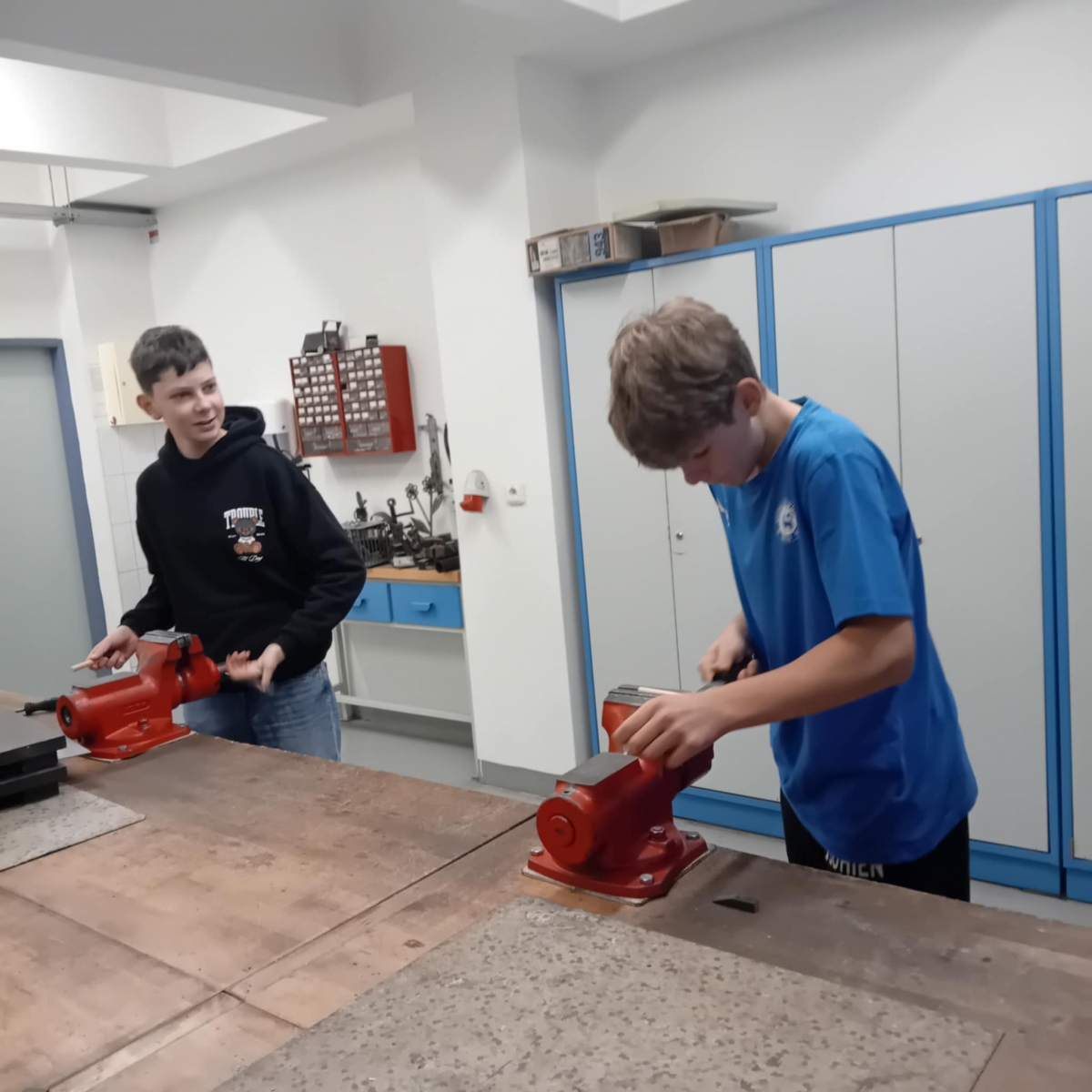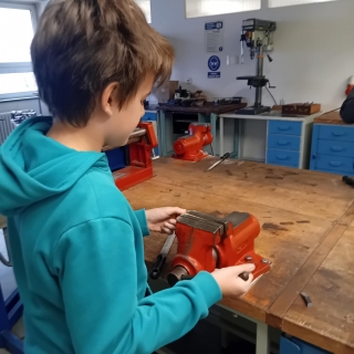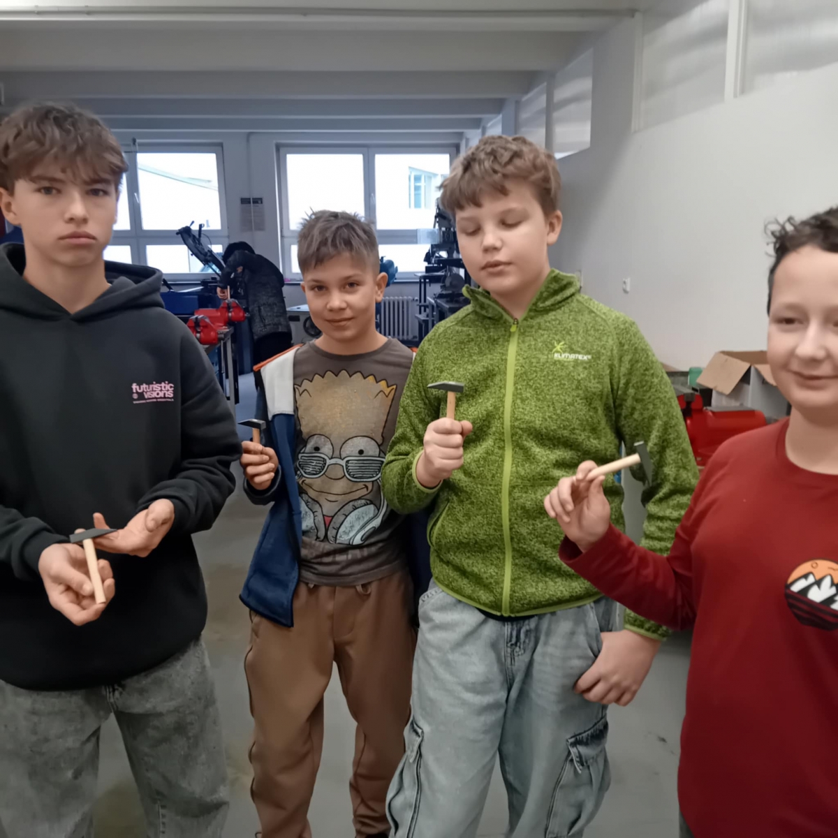 • Klučičí skupina se pustila do práce s kovem a dřevem a během dopoledne si vyrobila vlastní kladívko. Nechybělo měření, pilování ani montování – a všichni to zvládli na výbornou.