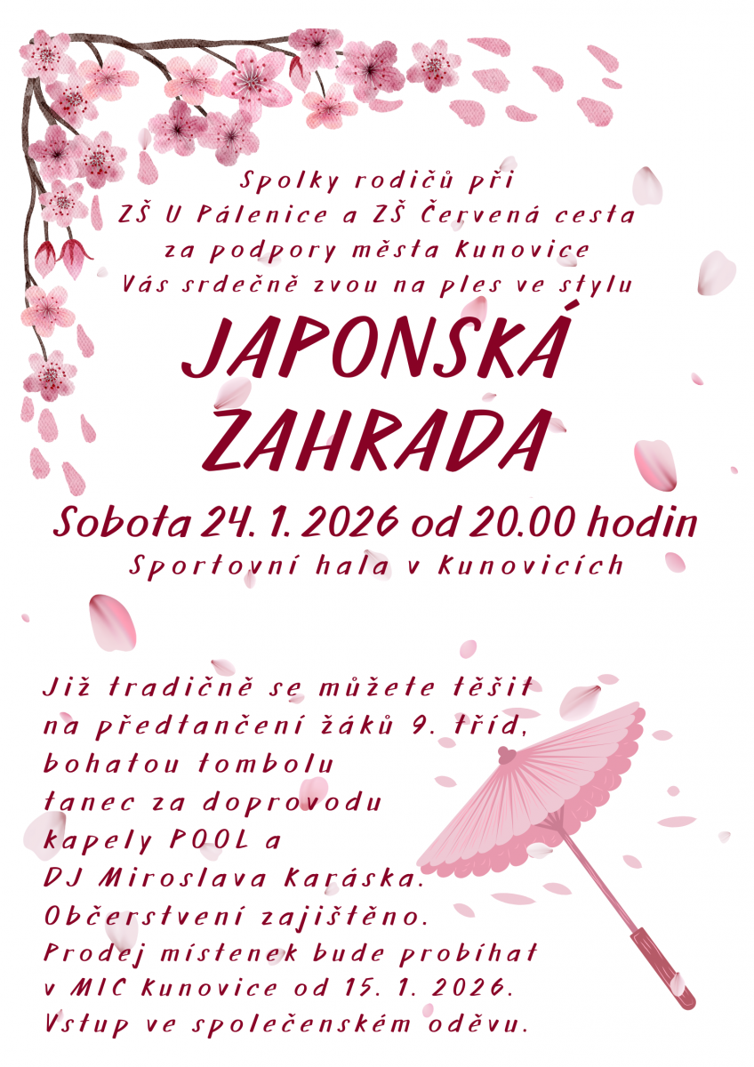 Přijměte naše srdečné pozvání a pojďte s námi vstoupit do japonské zahrady plné tančících deváťáků. Tradiční ples Spolků rodičů se koná již tuto sobotu 24. 1. 2026 od 20:00 ve sportovní hale v Kunovicích.